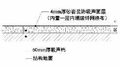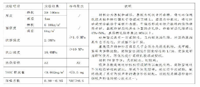 裝飾面層為砂巖環(huán)保吸聲材料,可釆用刮抹或噴涂的方法, 覆蓋于基層吸聲棉板上,形成大面積無(wú)縫隙的具有砂巖親切質(zhì)感 的室內(nèi)裝飾效果。在裝飾面層的砂巖材料內(nèi),施加了柔性硅砂改 性技術(shù),所形成的面層具有適當(dāng)?shù)娜釓椥?,加之材料?nèi)部充滿孔 隙,對(duì)濕熱漲縮具有自適應(yīng)性,大面積條件下接縫處亦不會(huì)開(kāi)裂, 連續(xù)面積可大于3000m2。